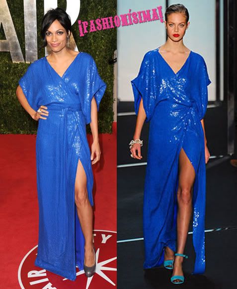 Las curvas latinas de Rosario Dawson se refugiaban en un caftán de paillettes, azul eléctrico, de Donna Karan