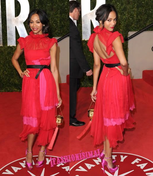 Zoe Saldana obraba la combinación perfecta entre el carmín y el fucsia gracias a su Prabal Gurung